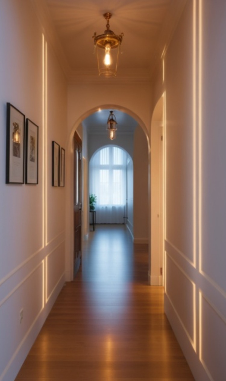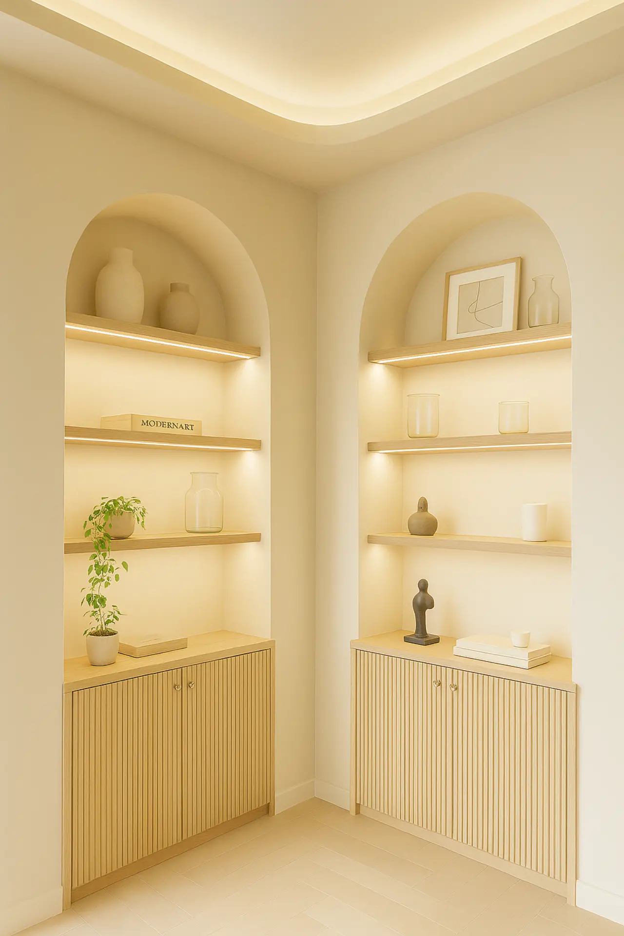 תכנון מדוקדק של אלמנטי הגבס (הנמכות, נישות, קרניזים) ושילוב תוכנית תאורה אדריכלית, עם הדמיה ברורה של התוצאה