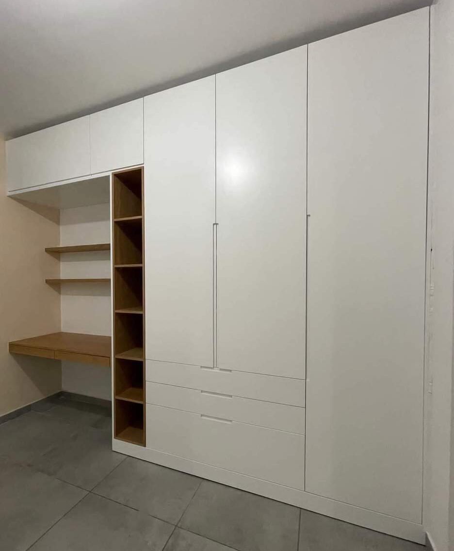 / ארון 3 דלתות ומגירות בציפוי פורמייקה עם שולחן ונישה של מדפים בהתאמה אישית