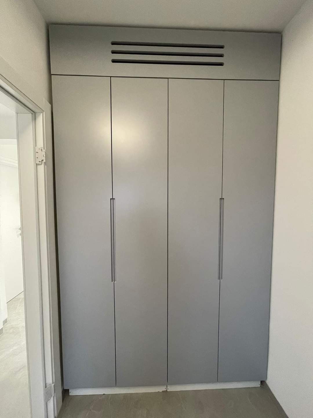 ארון 4 דלתות בציפוי אפור עם ידיות אינטגרליות ותוספת לתעלות מזגן בהתאמה
