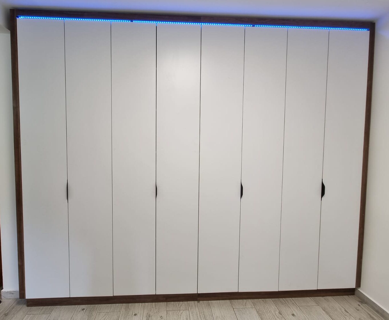 ארון 8 דלתות בציפוי פורמייקה עם ידית מתכת בצבע שחור בשילוב תאורה