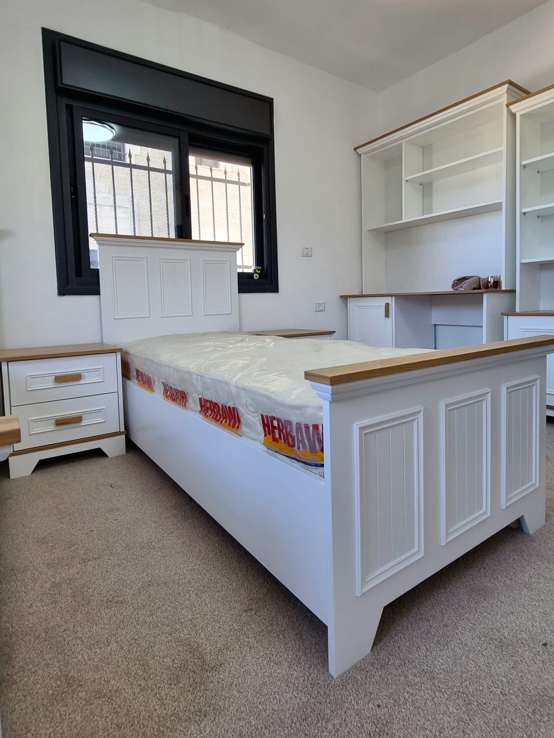 / חדר שינה בעיצוב אישי בתוספת קרניז בגב וראש המיטה. ספריה+שולחן ומגירות בצד המיטה
