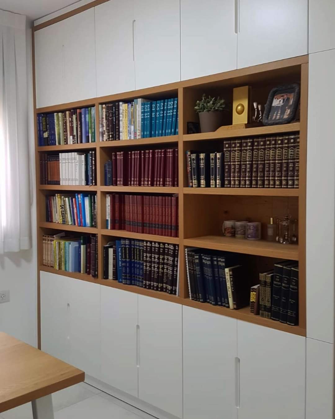 ספרית קודש בשילוב עץ טבעי ופורמייקה שמנת וידיות אינטגרליות
